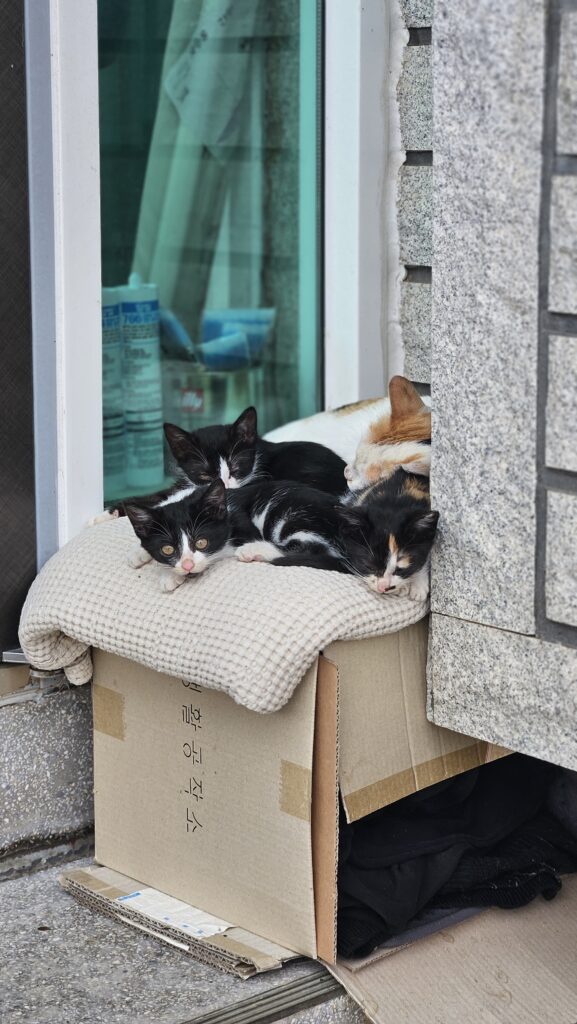 단호하고 야무지게 생긴 애순이와 달리 삼남매 어린 고양이들은 순둥순둥, 무늬도 알록달록 예뻤다.