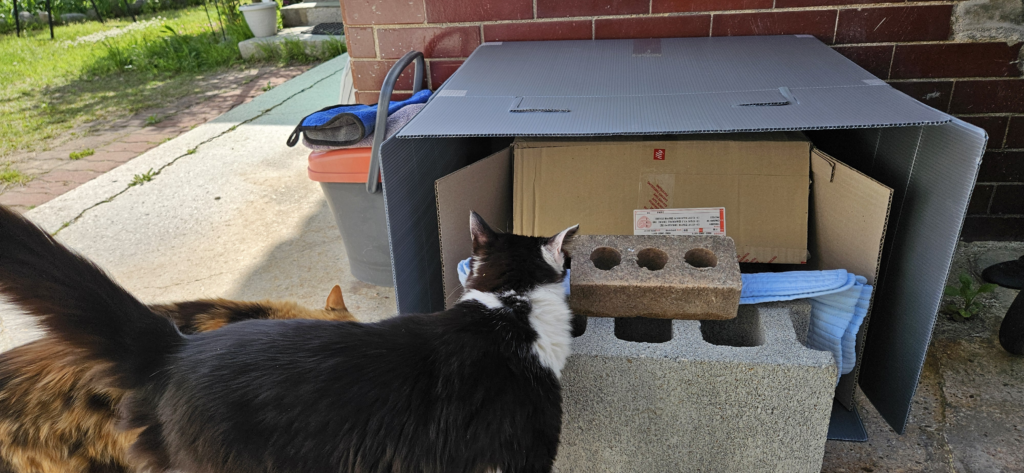 다른 고양이가 볼까 싶어 박스 위를 다른 박스로 덮어 주었다.