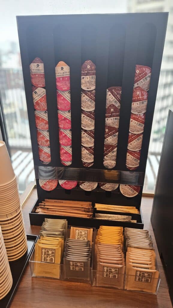 그라피 호텔 7층 라운지에 정수기, 커피캡슐, 간단한 간식이 있다.