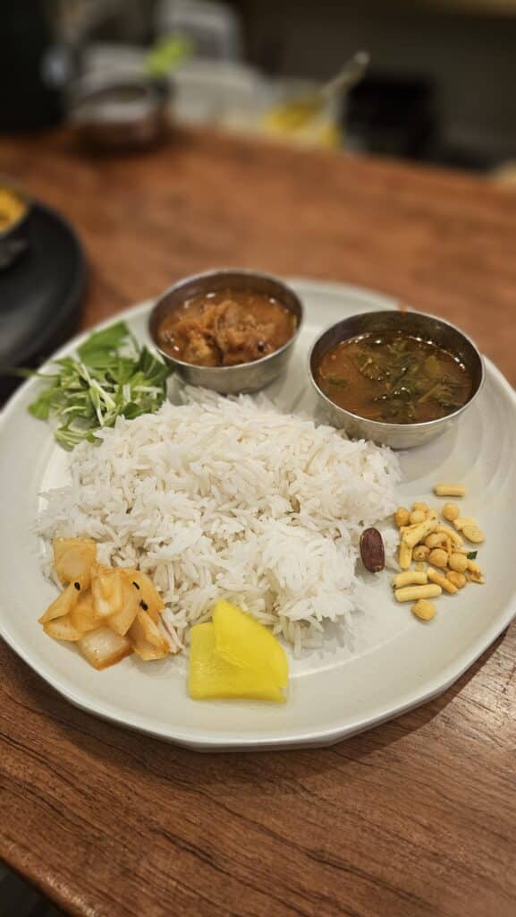 찰기가 거의 없는 바스마티 쌀과 두 가지 종류의 카레, 약간의 고수와 단무지, 양파절임이 나오는 런치세트.
