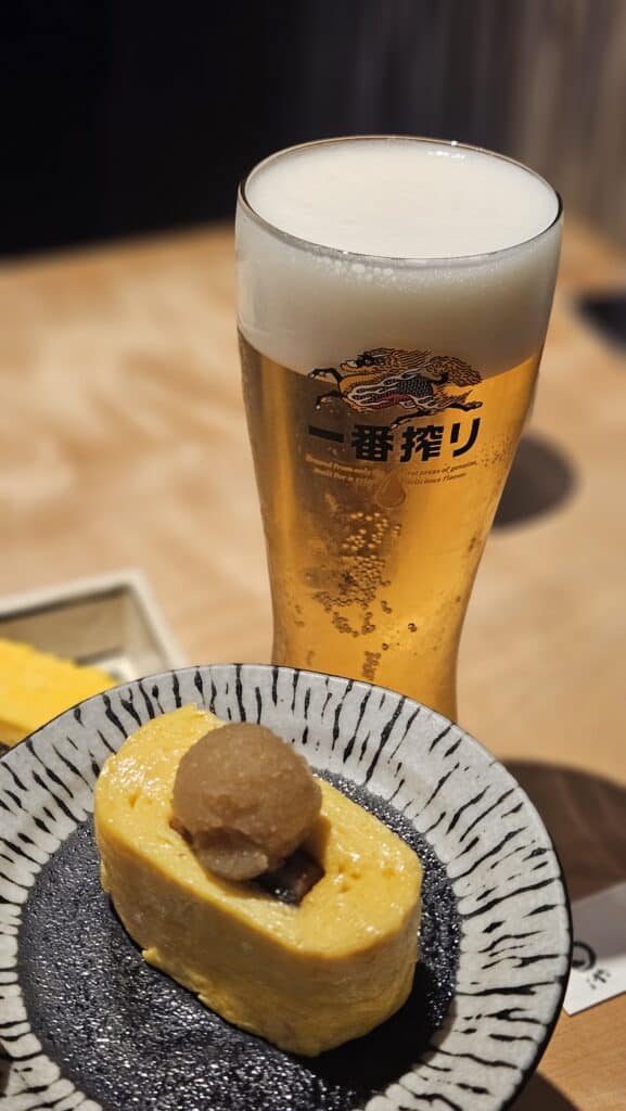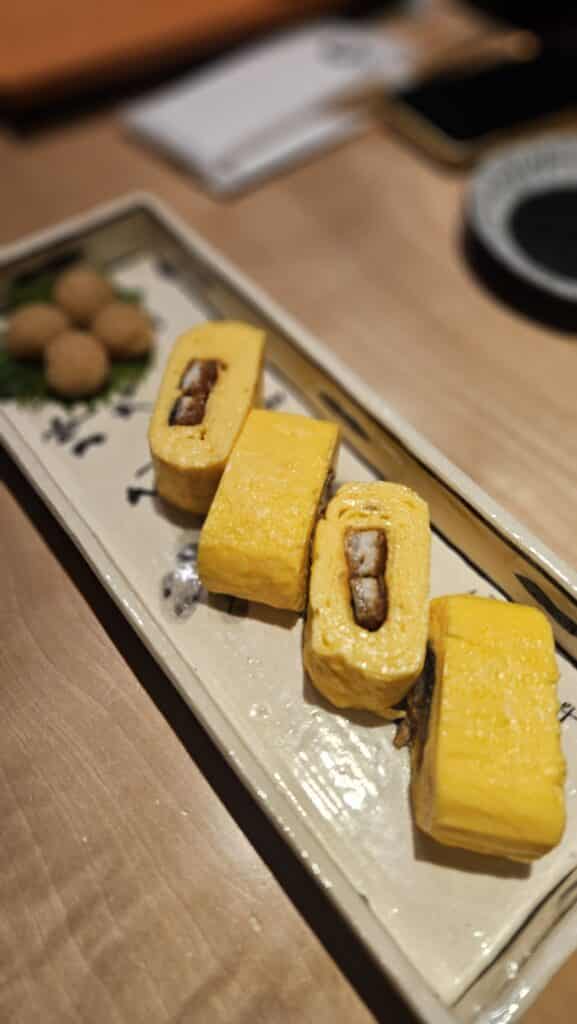부드럽고 달큰한 계란말이 속에 장어구이가 쏙 들어가 있는 우마키. 한 잔 쭉 들이킨다.
